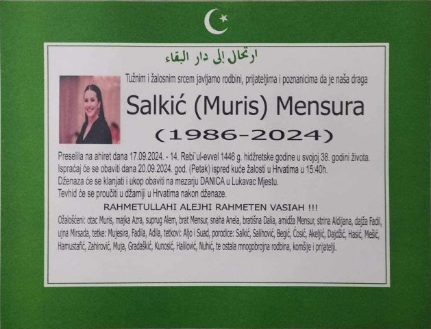 Mensura Salkić, sestra nekadašnjeg učesnika ZMBT showa Mensura Salkića, prekjučer je napustila ovaj prolazni svijet. Njen brat se emotivnom porukom oprostio od svoje sestre te zamolio prijatelje da pokažu poštovanje njegovoj porodici zbog situacije koja ih je zadesila.
