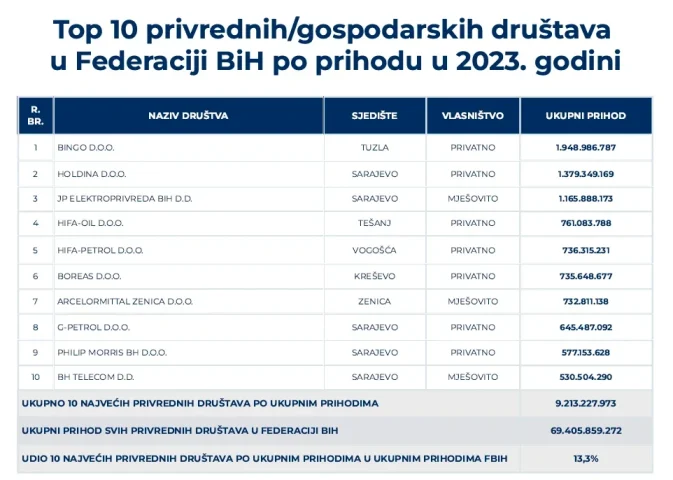 Najvećih deset kompanija u Federaciji BiH ostvaruje ukupan prihod od 9,2 milijarde KM, dok je ukupan prihod svih društava u FBiH 69,4 milijarde KM.